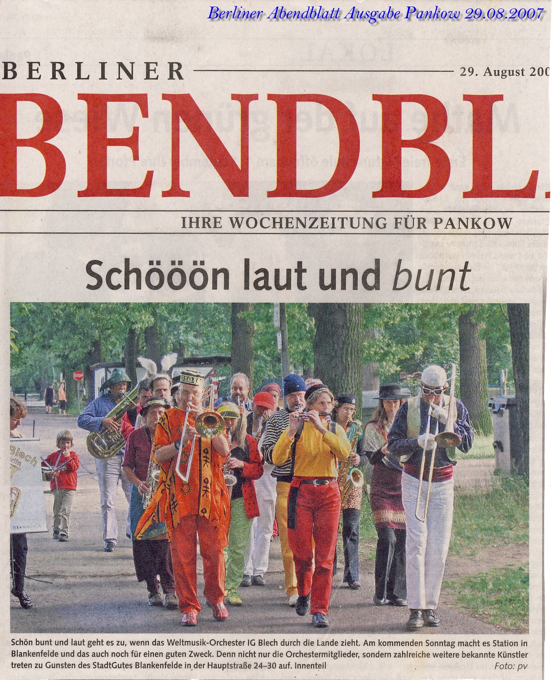 Federnder Samba, afrikanischer Grove, katalonischer Saradana, jüdischer Klezmer und was der Exotik mehr ist, steht auf dem Programm von I.G. Blech . Und die alten Fans kennen die Ohrwürmer bereits beim ersten Ton, heben lauschend die Köpfe, bis der Rhythmus übergeht ins Blut, um spastisch mit den Glieder zu zucken, den Rumpf kreisen zu lassen. Was auf dem Kreuzberg allerdings einfacher ist als unter Aufnahmebedingungen, wenn die heavymessingworldmusic den Leib hochheben und in die rhythmische Steinzeit katapultieren möchte.